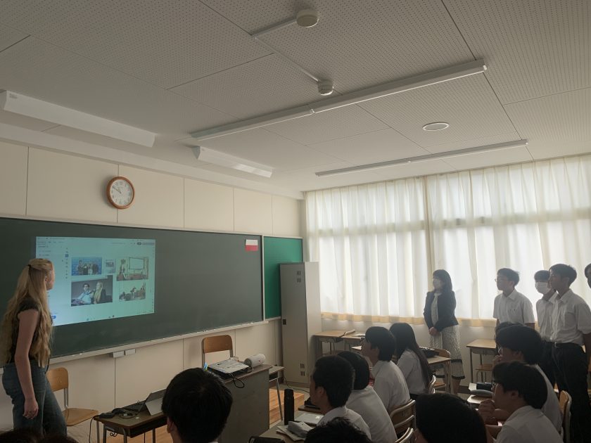 9月19日(金)、新城市の国際交流事業の一環として、ポーランドからインターンシップで来日されたKamilaさんが本校に来校されました。 文理系3年生の総合選択科目「英語探究γ」の授業に