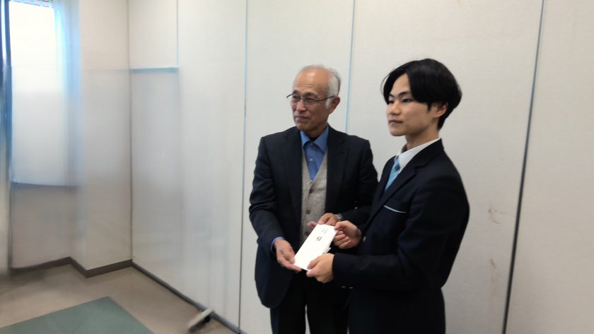 12月19日(金) 歳末助け合い募金贈呈式が行われました。 9月に行われた学櫻祭において、3年生による模擬店の収益金を歳末助け合い募金へ贈呈しました。 前期生徒会役員代表が新城市社会福祉