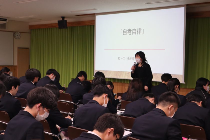 12月23日(火)2学期終業式が行われました。 校長式辞は、2学期の気候、季節感にふれ、インフルエンザ等感染予防について話があり、学櫻祭、クラスマッチ、修学旅行、花火の鑑賞など学校行事、学