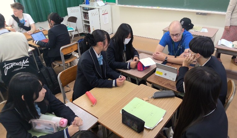 6時限目には、文理系3年生の「論理表現Ⅲ」の授業において、グループディスカッションを行いました。生徒たちは各グループでトピックを決め、新城市に関する英語クイズを出したり、地域の祭りや好きなスポーツなどを紹介、プレゼンテーションしたりするなど、ローテーション形式で各国のユースと交流しました。
