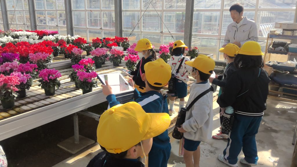 また、校内の農場も見学し、動物にエサやり体験をしたり、シクラメンとポインセチアの栽培風景を見学しました。