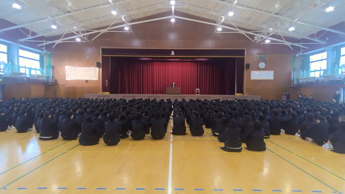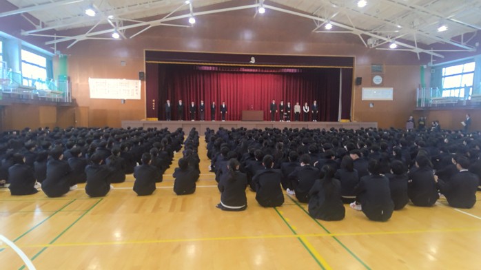 お知らせ/学校生活 「1学期始業式」 2026年4月7日 4月7日(火)1学期始業式、新入生対面式、新転任者紹介が行われました。 校長は式辞で中国の農書「農説」の言葉を分かりやすく紹介し、学業に通ずる言葉から受け取るものを考えるよう生徒に呼びかけました。 続く対面式では、在校生代表が「新しい歴史を作ろう」と呼びかけ、新入生代表生徒は「全てに一生懸命取り組む」と力強く決意を述べました。